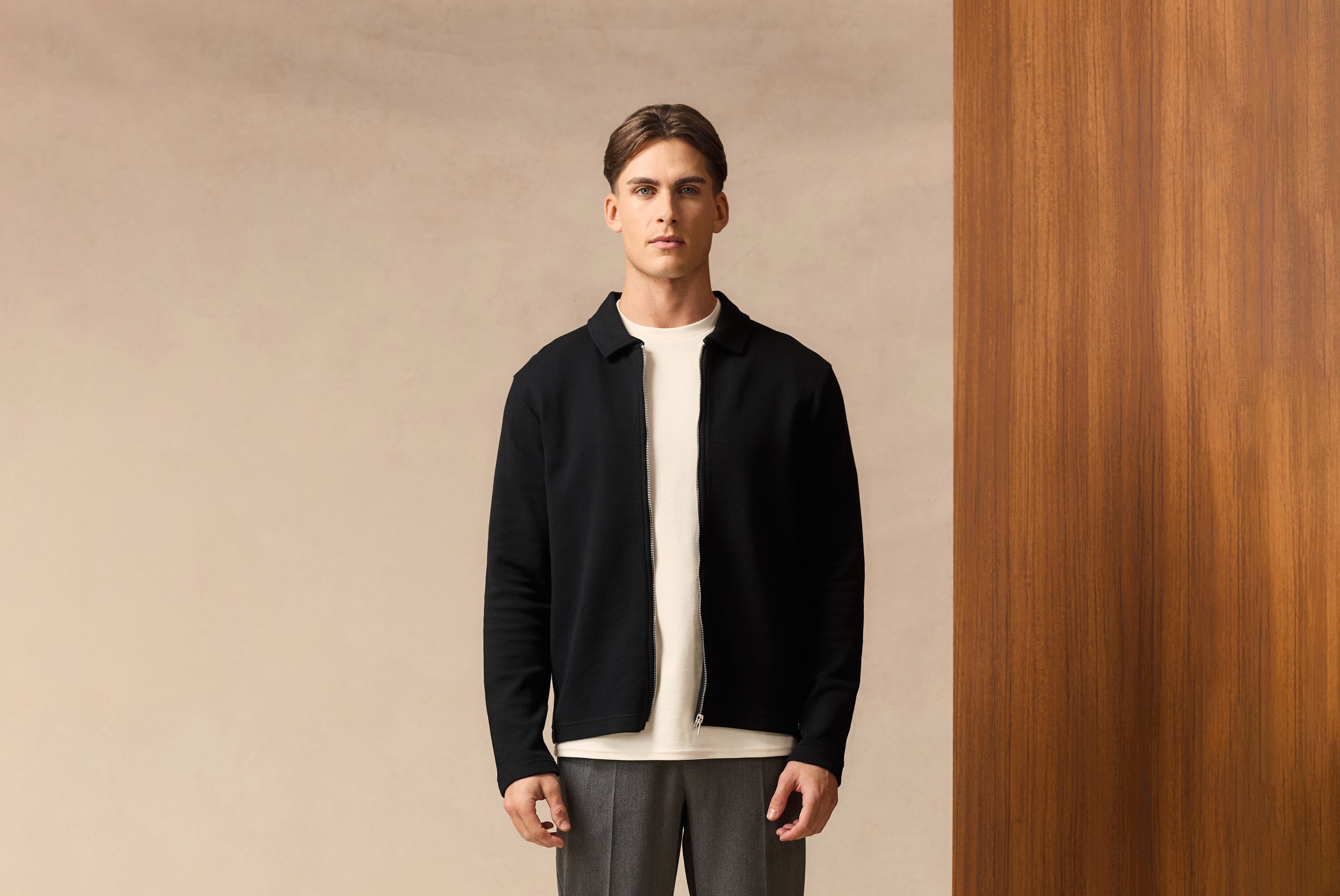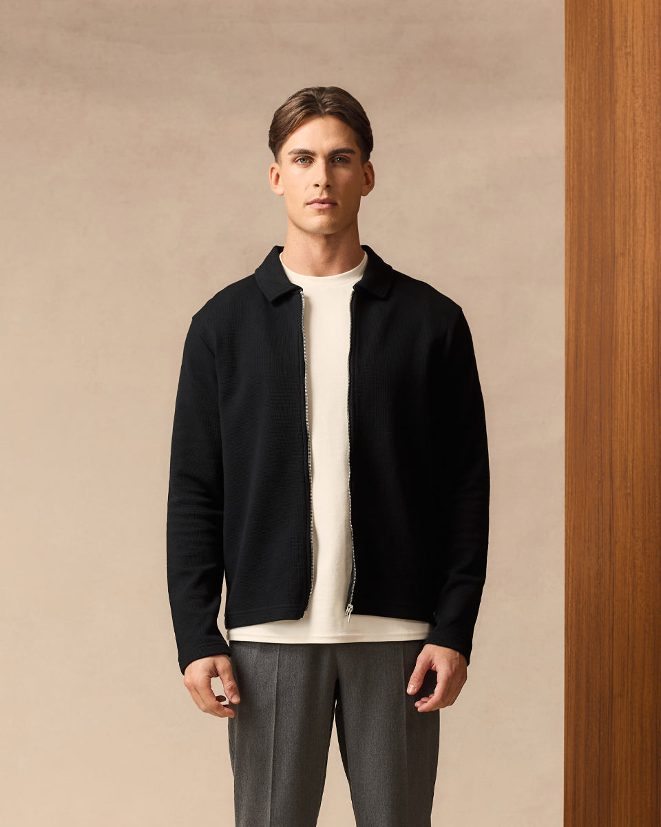 Redefine your transitional wardrobe with the Waffle Zip Overshirt. Crafted in classic black, this piece is engineered to bridge the gap between smart and casual.
